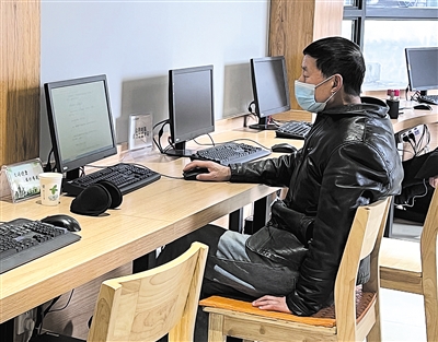 图书馆内,市民佩戴口罩入座使用电脑。