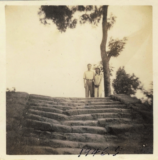 在一张用钢笔标注了日期“1946﹒5”的照片上,一着白色衬衫、长裤的男子和一身穿旗袍的女子依偎而立,前面有一排长长的石阶。张旭东通过仔细辨认和相关核查,认为是萧萐父和恋人卢文筠在老霄顶上的合影。
