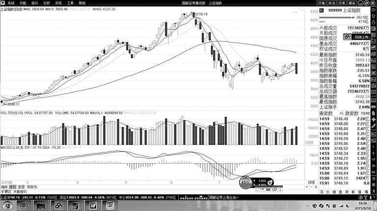 当日上证综指以3999.13点小幅高开,早盘上摸4006.34点后开始震荡下行,接连突破多个整数位并下探3743.39点后,沪指以3748.16点报收,较前一交易日大跌245.51点,跌幅高达6.15%。深证成指收盘报12683.86点,跌890.05点,跌幅高达6.56%。创业板指数大跌6.08%,收盘报2504.17点。