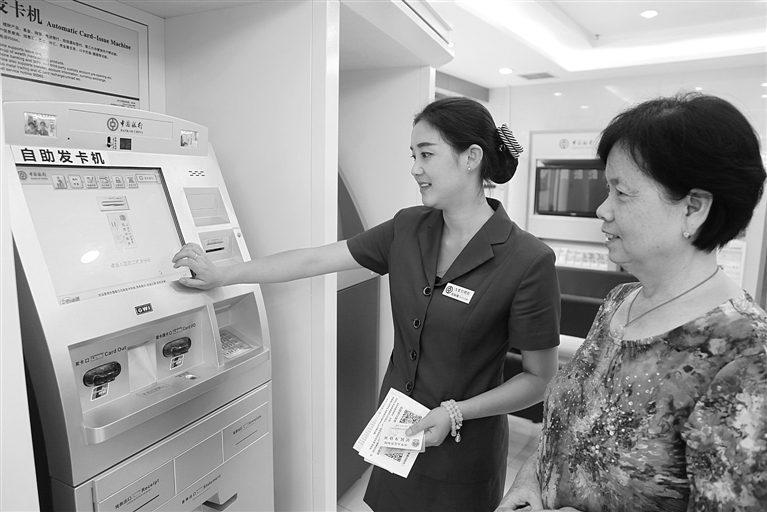 为了有效应对客户金融交易习惯的变化,降低运营成本,增强服务能力,我市多家银行机构加快建设智能化服务网点,配备自助发卡机、自助终端等智能服务设备,设立手机银行、网上银行、智能银行等电子银行体验区,一对一为客户讲解操作流程。智能网点建成后,银行服务效率大幅度提高,为客户节约了时间,好评不断。据介绍,除大额取现等少数业务外,其余大部分业务客户都可以通过智能设备自助完成。图为中国银行乐山分行工作人员正在引导客户使用自助发卡机。