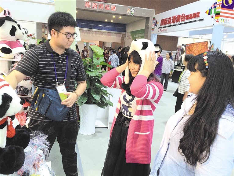 融入四川元素的熊猫周边产品、拥有2000多年历史的“嘉洲绣”、充满彝家风情的彝绣……展区内,各式各样的旅游商品让人眼花缭乱。