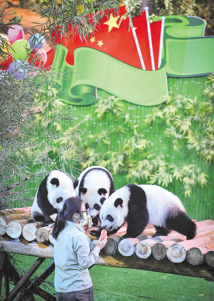 9月28日,广州长隆野生动物世界的三胞胎大熊猫参加迎国庆活动。