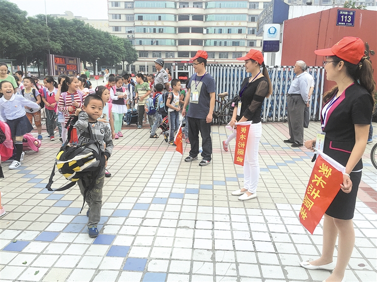 近日,记者在峨眉山市第一小学校外看到,接送孩子的摩托车整齐停放在警戒线外,四轮机动车全部停放在距离学校约200米外的停车场内。这一切,都得益于该校家长委员会的交通疏导工作。今年以前,在该学校门口,不管是上学还是放学,总是堵得水泄不通,还经常出现孩子找不到家长的情况。对此,家委会组织家长志愿者在校门口执勤、划分区域停放车辆、邀请交警部门协助规划机动车限行时段等,一系列举措实施后,上下学高峰期的交通顺畅了,孩子更安全了,家长也放心了。图为家长志愿者在校门口执勤。