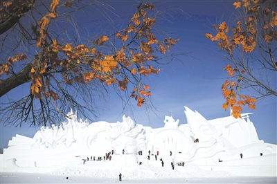 12月24日,哈尔滨太阳岛雪博会主塑露出“芳容”。本届雪博会主塑“星河之旅”长106米,高32米,宽20米,用雪量达4万立方米。图为雪雕师在制作太阳岛雪博会主塑“星河之旅”。