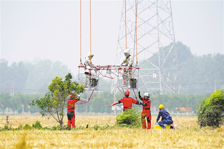 6月18日,在河北省临漳县境内的±800千伏昭沂线(河北段),直升机用吊篮把两名检修人员“吊”到有缺陷的特高压线路上,线路检修完成后,直升机再将检修人员“吊”到地面。直升机带电作业是当前世界上少数国家在电力主网维护检修方面采用的作业手段,有快捷、高效、技术含量高等特点。