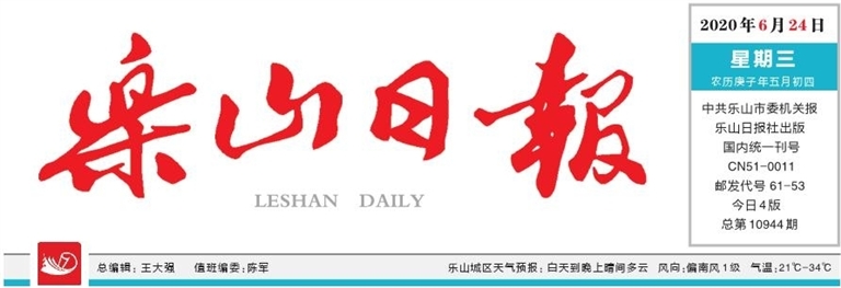 2020年6月24日 星期三农历庚子年五月初四今日4版 总第10944期 乐山城区天气预报: 白天到晚上晴间多云 风向:偏南风1级 气温:21℃-34℃