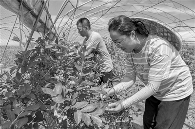 图为7月21日,在吉林省白城市洮北区青山镇黎明村的大棚里,王伟(右)、才洪力在采摘蓝莓。