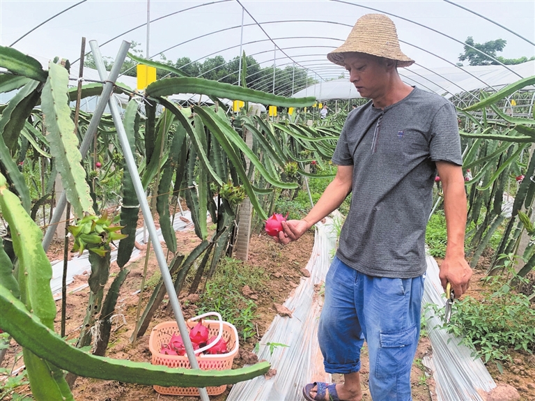 近年来,王村镇制定的一村一特色、“美丽王村、美食王村”的发展模式和发展理念,激发了返乡农民工回乡创业激情,助推特色产业落地、发展。2018年下半年,常年在外务工的孙永忠回到家乡,流转近55亩土地建起了果瑞家庭农场,而“红红火火”的火龙果便是他种植的首选。“我们这里光照充足,产出的火龙果甜度高、水分足,很受消费者喜爱。”孙永忠说。