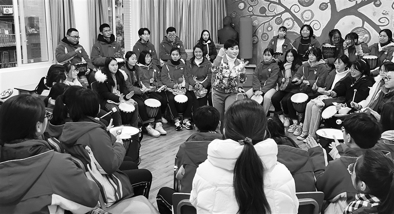 当日,在该校心理成长与生涯发展中心的团体辅导活动室内,同学们围坐成一圈,参加“鼓舞身心”心理拓展活动。在“用乐器表达我”环节,不同性格气质的同学展现着独特的自己,创造属于自己的音乐,也通过不同的音乐重新认识其他同学,在团体内被聆听、被尊重、被鼓励。