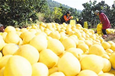 冬至临近,湖北省恩施土家族苗族自治州宣恩县的柚农抢抓晴好天气采摘贡水白柚,供应市场。贡水白柚是国家地理标志保护产品,当地种植面积达15万亩,覆盖8个乡镇82个村,村民们通过发展白柚产业实现脱贫增收。