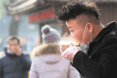 12月21日,一场冬至饺子节在陕西西安市永兴坊园区举办。市民和游客在现场包饺子、吃饺子,体验传统民俗。图为在西安永兴坊,一名男子在吃饺子。