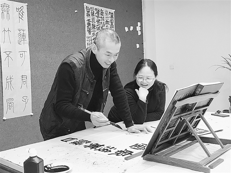 当时教我的老师告诉我,书法要返璞归真,要写出金石味。我觉得这个说法很玄妙,就天天琢磨,越想越投入 。1996年,我带着对书法的更高追求、对名师的向往和对爱情的追随,辞职从广西来到妻子的家乡。