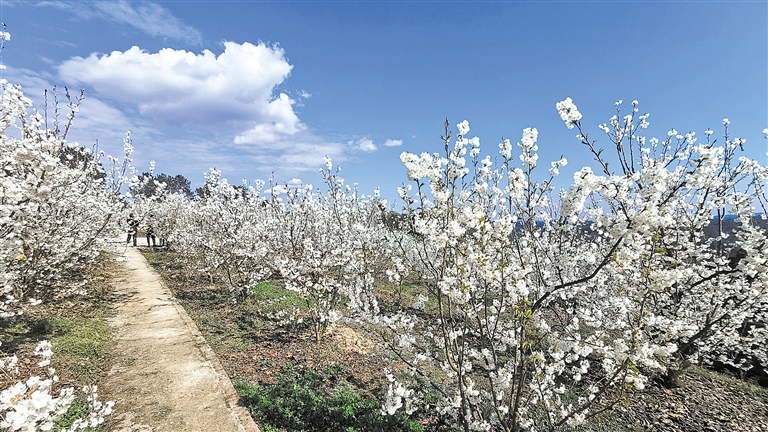 连日来,犍为县芭沟镇水晶樱桃现代农业产业园的3000亩樱桃花竞相开放,春意盎然,吸引众多市民游客前来踏青赏花。