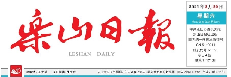 2021年2月20日 星期六 农历辛丑年正月初九 今日4版 总第11171期 乐山城区天气预报: 白天到晚上多云,局部地方有分散小雨 风向:北风1-2级 气温:10℃-21℃