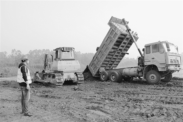 2月23日,省道215线大件过境公路工程项目建设正火热推进。记者在位于市中区水口镇的施工现场看到,装载车辆、挖掘机、压路机等往来穿梭,进行路基填筑,多名施工人员在旁指挥配合,现场忙碌而有序。