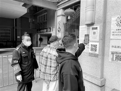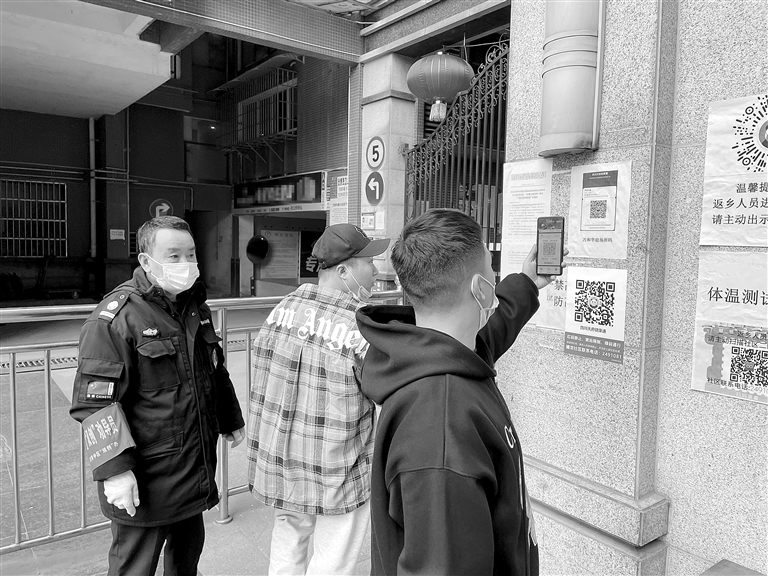 本报讯 (记者 倪珉 祝贺 文/图)连日来,我市各物业企业扎实开展疫情防控常态化工作。记者在中心城区各住宅小区看到,物业人员对进入小区的人员均进行了体温检测,同时要求出示健康码并扫描场所码,对体温异常人员进行信息登记并及时上报,全力配合社区做好防疫监管工作。此外,物业人员还积极做好外来人员、返乐人员动态管理,落实每日报告制度。