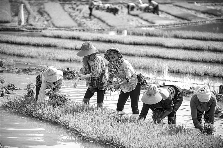图为郭玉兰(左三)与村民们在田里插秧(3月4日摄)。