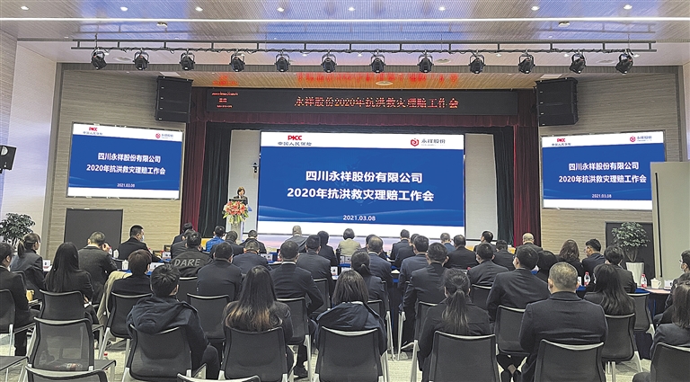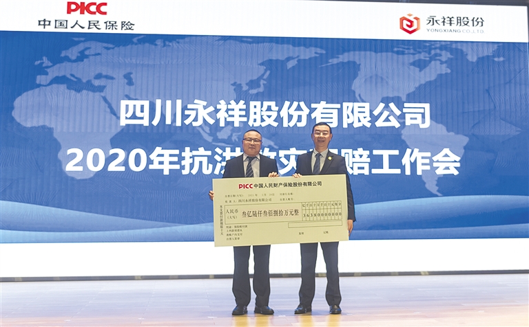 3月8日,人保财险四川省乐山市分公司、四川永祥股份有限公司2020年抗洪救灾理赔工作会举行。会上,双方进行了赔付支票交接。2021年2月7日,人保财险乐山市分公司成功向四川永祥股份有限公司支付2020年8月中旬特大暴雨洪灾赔款3.638亿元,该笔赔款也创下了人保财险四川省分公司巨额赔款纪录。会议的顺利召开,标志着人保财险对四川永祥股份有限公司2020年8月中旬特大暴雨洪灾的救灾理赔工作圆满收官。