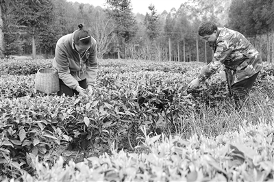 本报讯(夏平 文/图)近日,在马边彝族自治县荍坝镇茶叶村茶园中,村民粟与伦和杨正香夫妇穿梭其间,手指在茶树嫩芽间上下翻飞,麻利地采摘茶叶嫩芽。