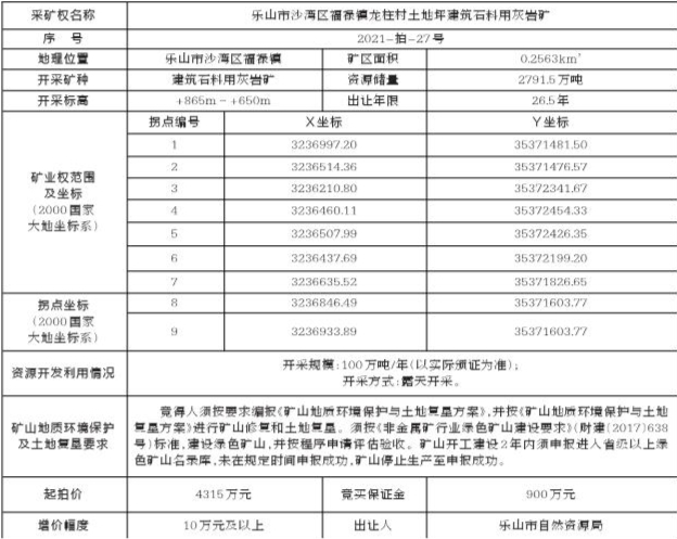根据《中华人民共和国矿产资源法》、《矿业权交易规则》等相关法律法规的规定,经乐山市人民政府批准,乐山市自然资源局委托乐山市土地矿权交易中心于2021年5月14日10:00在乐山市市中区柏杨东路199号二楼乐山市土地矿权交易市场公开拍卖出让乐山市沙湾区福禄镇龙柱村土地坪建筑石料用灰岩矿采矿权,现将有关事项公告如下:
