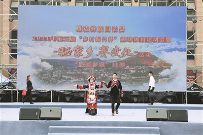 本报讯(记者 谭智鹏 文/图)为充分展现脱贫攻坚成果,坚定乡村振兴决心和信心,掀起文旅融合、经济社会发展新高潮,4月27日,峨边彝族自治县“赛村庄·赛乡镇”活动在该县东风新城广场火热举行,活动现场精彩纷呈、高潮不断。