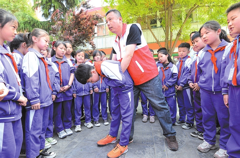5月8日世界红十字日到来之际,河北多地开展“急救知识进校园”活动,向学生传授心肺复苏、包扎等应急救护知识,提高学生紧急避险意识和应急救护能力。图为5月6日,在邯郸市峰峰矿区第二小学,峰峰矿区红十字会的志愿者为同学们讲解海姆立克急救法。