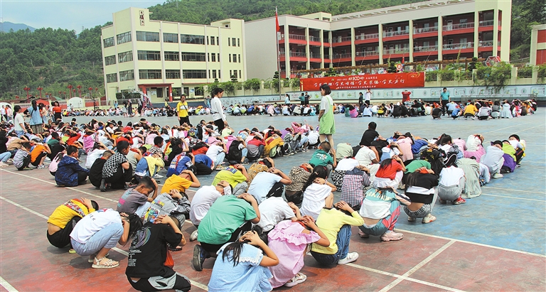 为进一步增强小学生应急避险意识,提高学生紧急避险、自救互救和应急能力,日前,马边彝族自治县实验小学举行应急疏散演练活动。演练活动模拟突然发生地震,全体师生立即展开避震行动,有序向安全地点疏散。图为学生双手护头疏散到安全地点。
