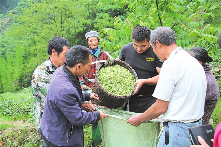 在河口村9组收购点,收购商放好电子秤,村民将刚采摘的金银花倒入口袋,等候上秤,收购商称重、登记、支付现钱。“今天摘了80斤,每斤8.2元,卖了600多元,在家门口一天挣几百块钱,很划算。”刚领到钱的花农吴邦海说。