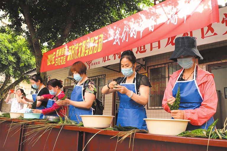 为弘扬传统文化,迎接端午佳节,昨(10)日,峨眉山市胜利街道白龙社区举办包粽子比赛,社区群众欢聚一起,包粽子、唱红歌,欢声笑语说幸福。图为活动现场。