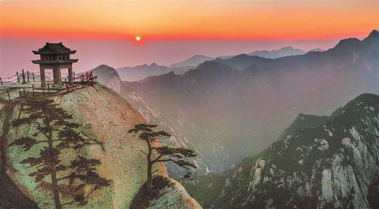晨曦初露,位于陕西省渭南市的华山景区沐浴在霞光之中,景色壮美。