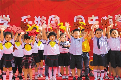 图为乐山市城北幼儿园的孩子们表演节目为祖国庆生。