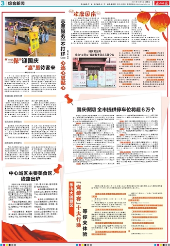 国庆假期,我市将继续大力推行“无预约、不旅游”理念,利用网络平台实现景区门票在线预约。同时,指导景区科学测算游客最大承载量,提升景区内交通运力;鼓励景区采取增开检票口、“刷脸”和刷证件等智慧化手段,减少等待时间;大力推广峨眉山景区、乐山大佛景区“三码合一”(健康码、场所码、门票码)做法,提升检票口通达度。
