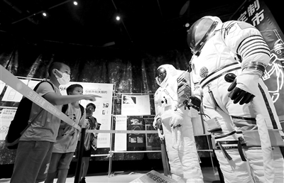 10月15日,上海天文馆(上海科技馆分馆)首个临展——情境式原创展览“生活在火星”开幕。展览以未来人类生活在火星为主线,将科学与艺术有机结合,从衣、食、住、行出发,带领公众沉浸式体验火星上的生活。图为小朋友们在上海天文馆观看一组航天服模型。