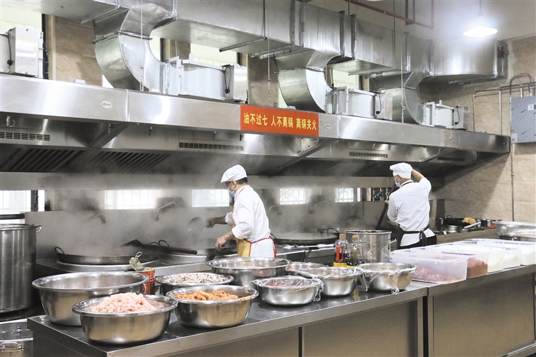 该校食堂实行原料进入通道、备餐进出通道、员工进出通道等单环路线。在食堂内部,食堂蔬菜切配间、肉品加工间、冷藏间、副食库、蒸煮间、食品留样室、餐具消毒间等各功能间分区明显,各区域明确了责任人和监督人,员工们严格按照食品安全要求进行规范操作。在食堂就餐区域,师生们可以通过人员健康监测系统、过程违规抓拍系统、食品安全检测系统、“明厨亮灶”视频系统的电子显示屏,对食堂情况进行实时了解、监督。