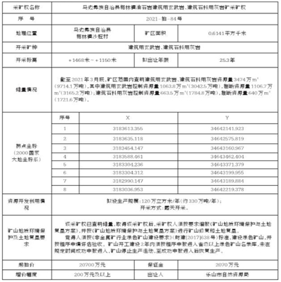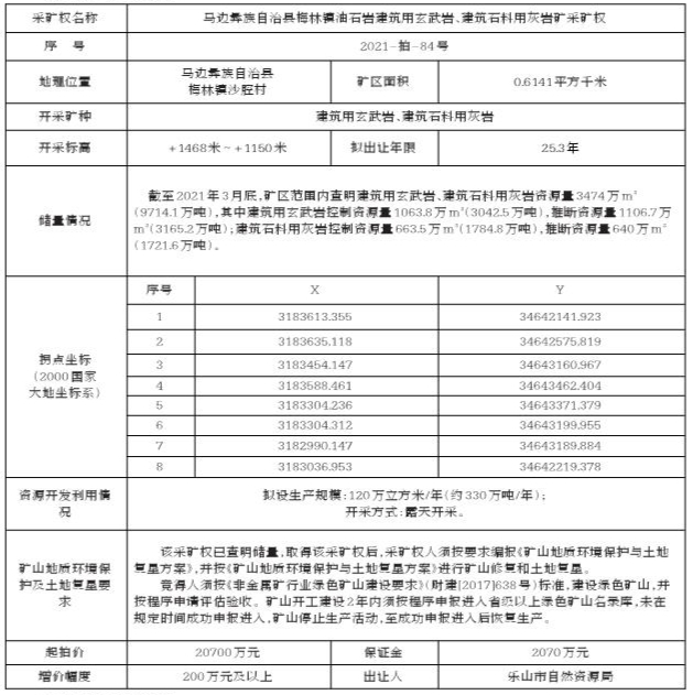 根据《中华人民共和国矿产资源法》、《矿业权交易规则》等相关法律法规的规定,经乐山市人民政府批准,乐山市自然资源局委托乐山市土地矿权交易中心于2021年12月16日10:00在乐山市市中区柏杨东路199号二楼乐山市土地矿权交易市场公开拍卖出让马边彝族自治县梅林镇油石岩建筑用玄武岩、建筑石料用灰岩矿采矿权,现将有关事项公告如下: