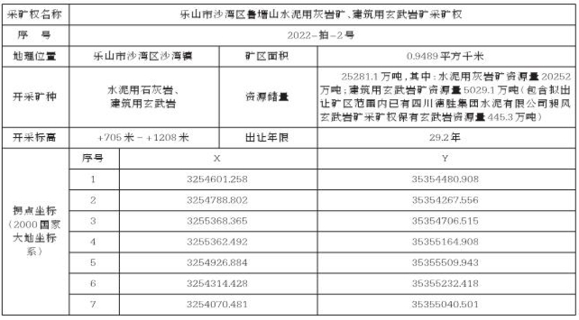 根据《中华人民共和国矿产资源法》、《矿业权交易规则》等相关法律法规的规定,经乐山市人民政府批准,乐山市自然资源局委托乐山市土地矿权交易中心于2022年3月4日10:00在乐山市市中区龙游路西段607号三楼(嘉兴路与龙游路交汇处)乐山市公共资源交易服务中心公开拍卖出让乐山市沙湾区鲁塘山水泥用灰岩矿、建筑用玄武岩矿采矿权,现将有关事项公告如下: