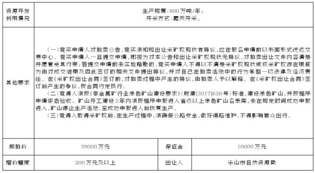 本宗采矿权出让方式为拍卖出让,采用无底价增价式拍卖,自由竞价,价高者得。本次拍卖的竞买人不得少于3家,若竞买人少于3家,出让人按照相关规定停止该宗采矿权拍卖。