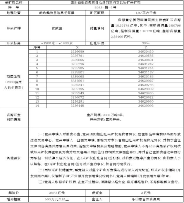 根据《中华人民共和国矿产资源法》、《矿业权交易规则》等相关法律法规的规定,经乐山市人民政府批准,乐山市自然资源局委托乐山市土地矿权交易中心于2022年4月13日10:00在乐山市市中区龙游路西段607号三楼(嘉兴路与龙游路交汇处)乐山市公共资源交易服务中心公开拍卖出让四川省峨边彝族自治县刘家沟玄武岩矿采矿权,现将有关事项公告如下: