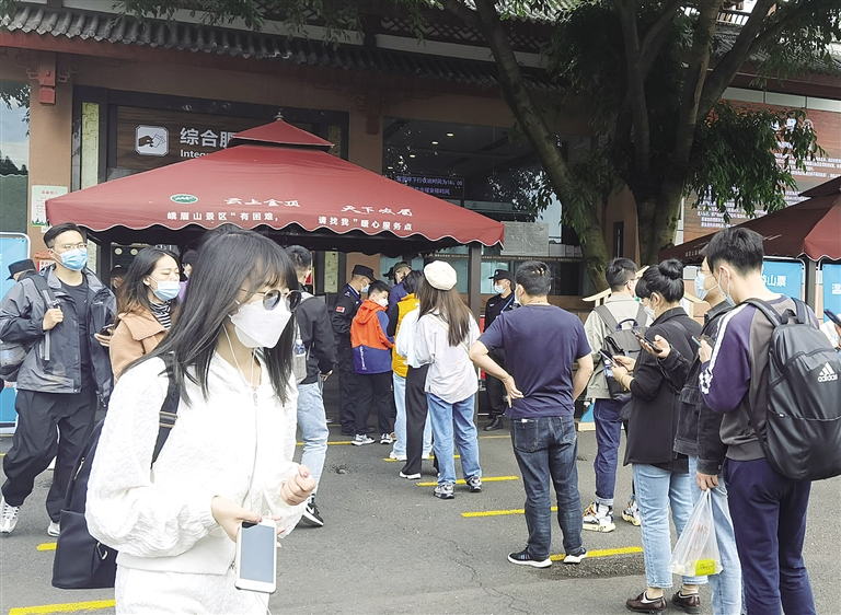 本报讯(记者 杨心梅 文/图)“五一”假期过半,乐山各大景点秩序良好、管理规范,全市文化旅游市场持续升温,实现安全、平稳、文明、高效、有序。记者了解到,为切实做好“五一”期间疫情防控工作,我市各景区景点坚持常态化疫情防控工作不放松,确保广大游客的身体健康和生命安全。同时,越来越多的市民和游客也自觉化身疫情防控宣传员、执行员,共同织密织牢疫情防护网。
