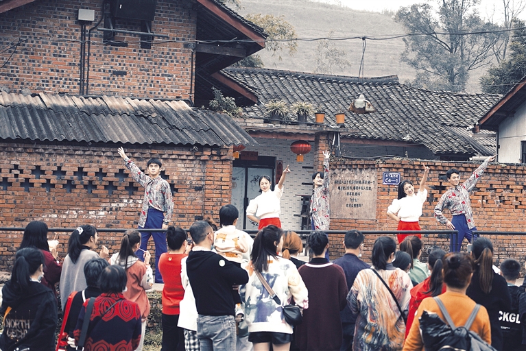 本报讯(记者 杨心梅)唢呐悠扬,锣鼓铿锵,昨(3)日下午,一场传统婚俗表演在《只有峨眉山》戏剧幻城热闹举行。游客们跟着“迎亲”队伍,感受上世纪80年代川西婚俗的喜气洋洋。