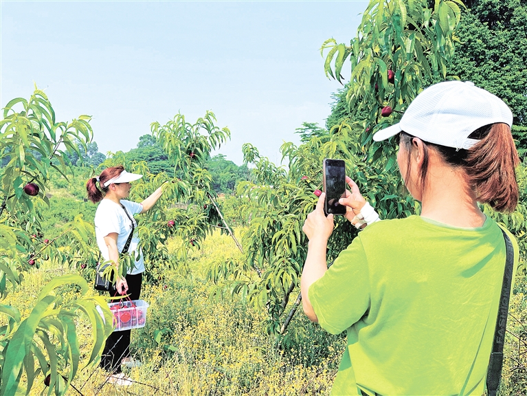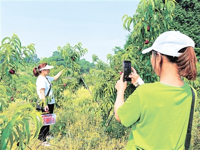 本报讯(记者 唐诗敏 文/图)初夏时节,气温渐升,黄油桃也迎来了成熟的季节。5 月7日,记者在峨眉山市桂花桥镇庙稿村看到,300多亩的黄油桃园内热闹不已,本地市民、游客纷纷前来采摘水果,拍照郊游。