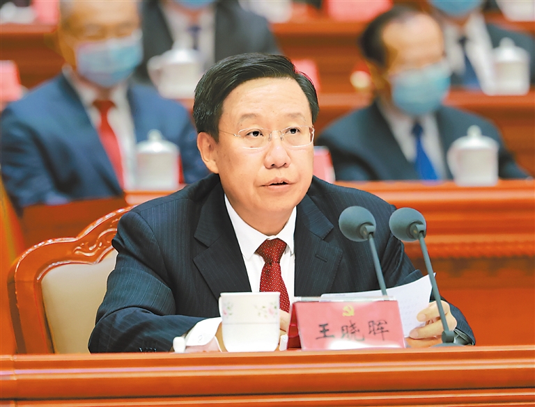 王晓晖指出,迈步新征程、谱写新篇章,必须坚持发展第一要务,坚定不移推动经济社会高质量发展。发展是解决一切问题的基础和关键,高质量发展是新发展阶段的主题。在历届省委的接续努力下,当前四川发展已经站在新的历史起点上,但发展不平衡不充分仍然是最突出的问题。要始终保持专注发展定力,紧扣立足新发展阶段、贯彻新发展理念、构建新发展格局、推动高质量发展,坚持稳中求进工作总基调,扎实抓好党代会作出的推动成渝地区双城经济圈建设、深入实施“一干多支、五区协同”“四向拓展、全域开放”战略部署等重大任务落实,全力以赴拼经济、搞建设,在保持全省经济质的稳步提升和量的合理增长上下功夫,努力跑出加速度、实现新跨越。要认真践行以人民为中心的发展思想,围绕“让人民群众过上好日子”,多谋富民之策、多办利民之事,千方百计惠民生、增福祉。要统筹发展和安全,坚决防范化解各类重大风险,推动四川现代化建设乘风破浪、行稳致远。