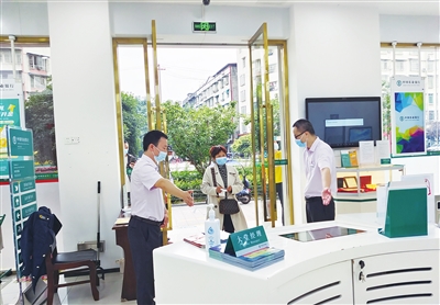 农业银行夹江支行坚持一手抓疫情防控,一手抓金融服务。一方面采取措施做好内外疫情防控工作,防范疫情风险传播,确保员工身体健康;另一方面,该行在做好营业网点内外消杀的同时,督促顾客自觉遵守防疫规定,在办理业务时保持间距,理解配合做好疫情防控工作。图为该行员工按防疫政策接待顾客办理业务。刘礼成 摄