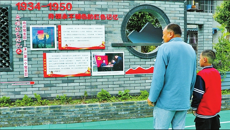 日前,笔者来到舟坝镇花山湾社区党建文化广场,一位老人正指着墙上的彩绘,向孩子讲述88年前沐川县第一个党支部成立的故事。画面中,木屋里煤油灯星光照耀,两名身穿旧式服装的青年人在一名领誓人的带领下,右手握拳平耳,庄严宣誓。篮球场旁的特色文化墙上, “社会主义核心价值观”“舟坝永不褪色的红色记忆”等主题宣传板块,图文并茂,通俗易懂。