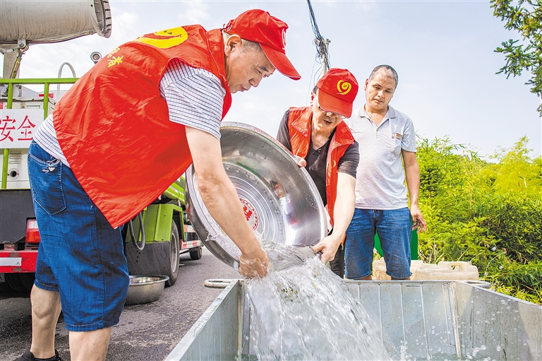 本报讯(万卫东 记者 张清 文/图)“我们正为吃水发愁,没想到这么热的天送水车直接把水运到了我们家门口,太感谢你们了!”8月23日上午,当送水车抵达因旱缺水的犍为县芭沟镇光辉村时,该村五组组长杨玉富对前来送水的嘉阳集团综合服务公司党总支的党员志愿者,竖起了大拇指。
