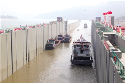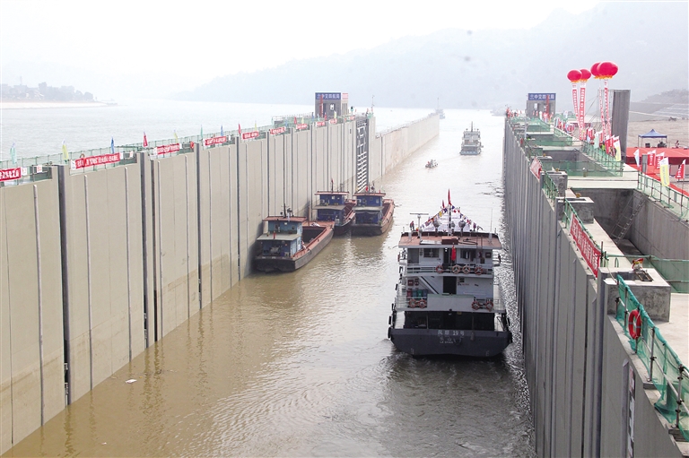 图为岷江龙溪口航电枢纽实现船闸通航。