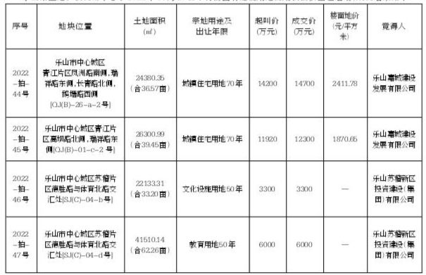 乐山市土地矿权交易中心于2022年11月29日举行的国有建设用地使用权拍卖出让活动,成交结果如下: