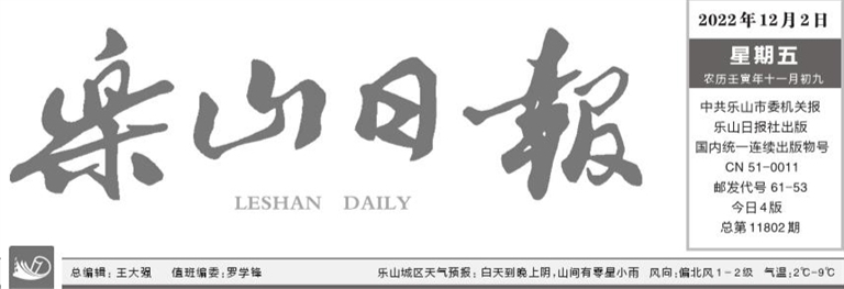 2022年12月2日 星期五 农历壬寅年十一月初九 今日4版 总第11802期 乐山城区天气预报: 白天到晚上阴,山间有零星小雨 风向:偏北风1-2级 气温:2℃-9℃