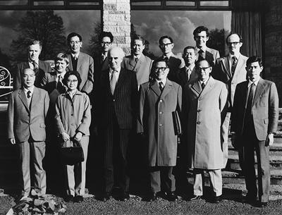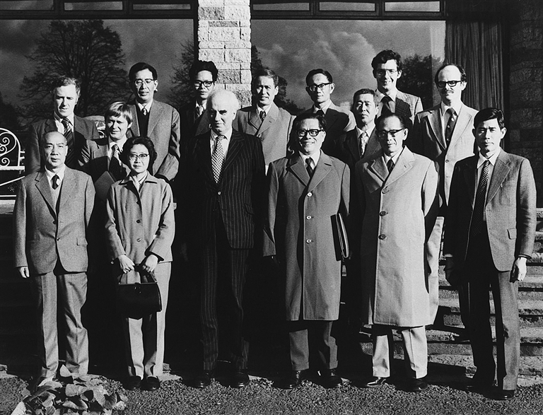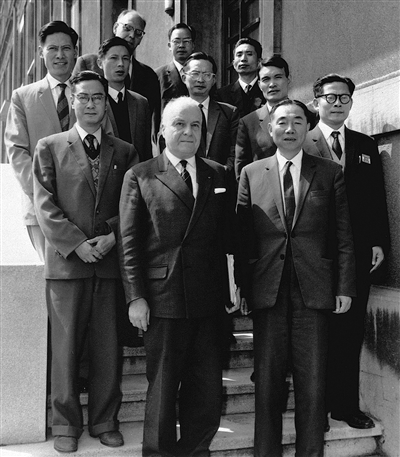 上图:1964年6月,江泽民同志(二排右一)在法国艾克斯莱班出席国际电工委员会会议期间同与会代表合影。