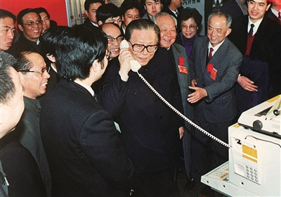 上图:1984年5月,江泽民同志在北京展览馆举行的全国电子新产品展览会上,试用国际长途电话向远方的工作人员问候。